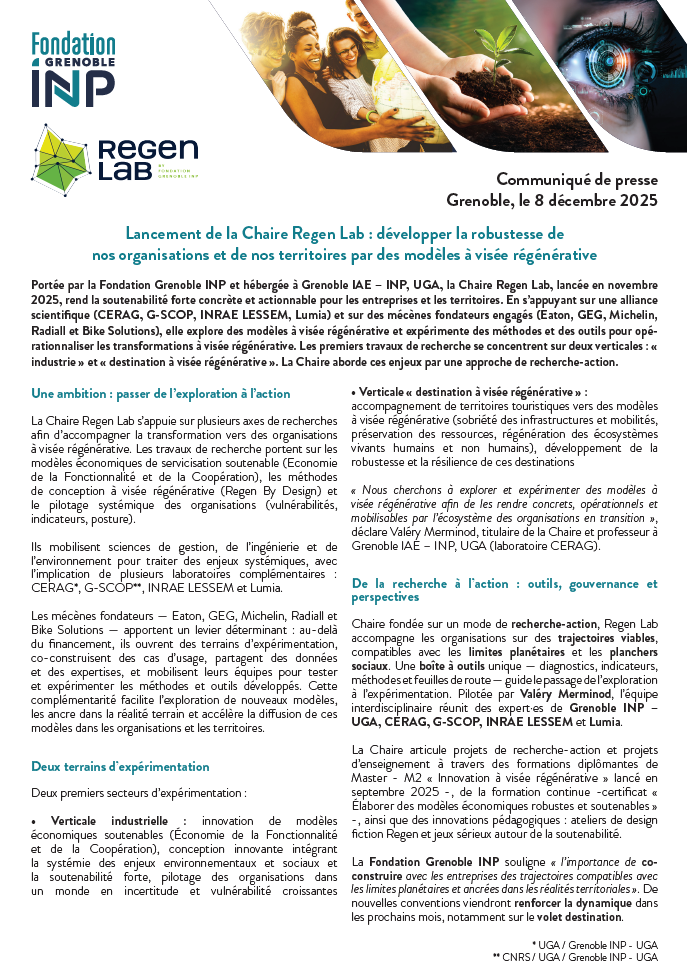 En 2024, la Fondation Grenoble INP a initié la création d’une chaire dédiée à ces enjeux de soutenabilité forte : Regen Lab. Celle-ci a démarré en septembre 2025. Sa raison d’être est d’explorer, co-concevoir, expérimenter et partager les modèles et outils nécessaires à l’opérationnalisation des stratégies à visée régénérative des acteurs économiques de notre territoire, afin de leur permettre de gagner en robustesse et garantir leur pérennité.